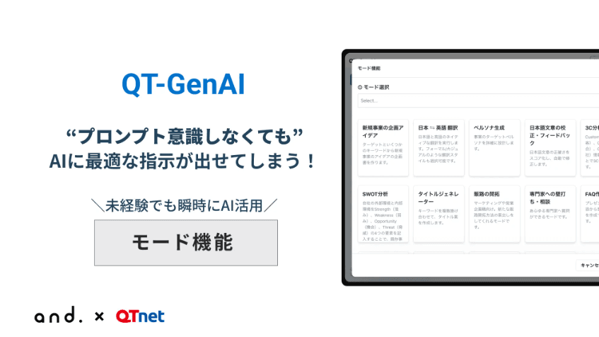 生成AIの普及が遅いのは、「活用イメージが湧かないから」という声も。QT-GenAIが、『プロンプト不要』で操作できるモード機能を追加