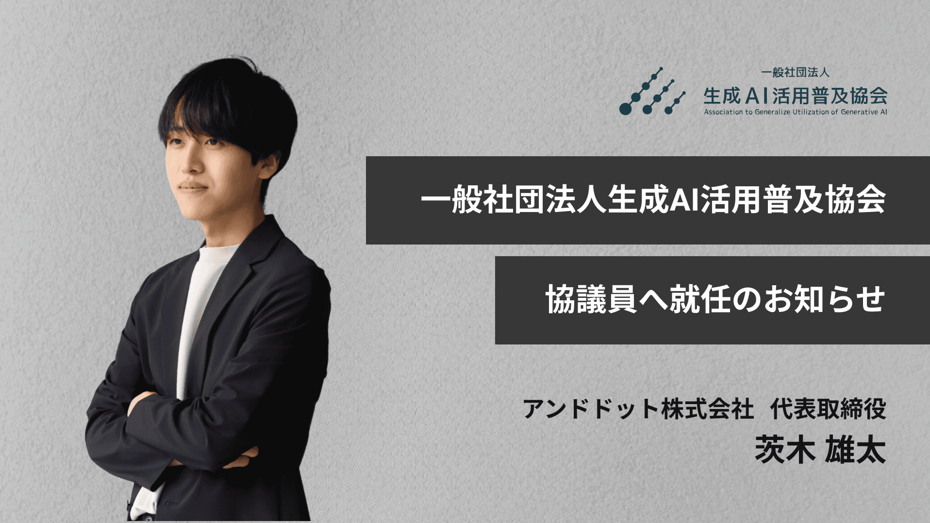 生成AIで社会課題を解決するために、AIコンサルティングサービスや研修など様々なAIソリューション事業を展開するアンドドット株式会社(本社:東京都渋谷区、代表:茨木 雄太)は、代表の茨木が、生成AIの社会実装を目的に、その第一歩としてスキルの習得・可視化を推進する一般社団法人生成AI活用普及協会(GUGA)の協議員に就任されました。