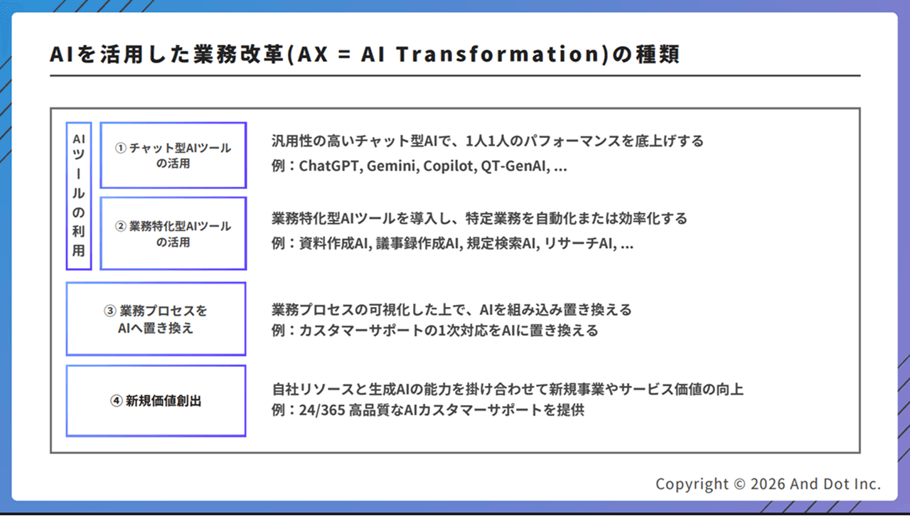 ④ 新規価値創出:自社リソースとAIを掛け合わせ、競合優位性やサービス価値を向上。