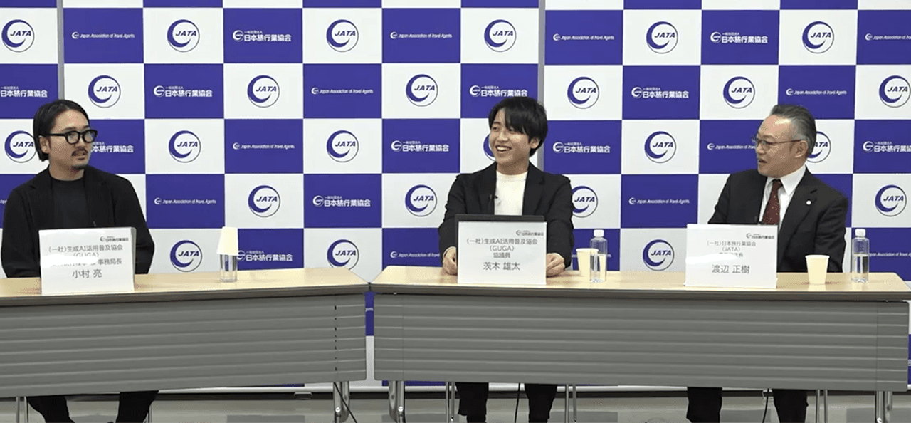 フォーラムの後半では、JATA事務局次長の渡辺正樹氏、一般社団法人生成AI活用普及協会(GUGA)の小村亮氏を交えた対談セッションを実施。 旅行業界ならではの「障壁」と、その乗り越え方について議論を深めました。
