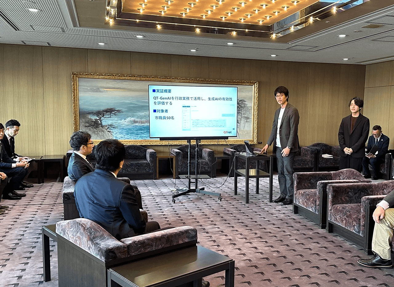 福岡市の高島市長からは、特に「モード機能」に興味を持っていただき、例えば過去の議会答弁を学習させて齟齬のない答弁案を作成する「議会答弁モード」など、自治体のニーズに特化したサービスがあると助かるといったコメントとともに、「QT-GenAI」の更なる展開に期待を寄せていただきました。今後は、生成AIのさらなる利用促進を進めていくと同時に、市民や観光客に向けた新しい価値の提供といった、先進的で実利の見込める取り組みに生成AIの活用を進めていく計画を立ててまいります。今後も市との連携を深め、活用の輪を広げ、福岡市が生成AIを最も活用している自治体となるべく取り組みを進めてまいります。