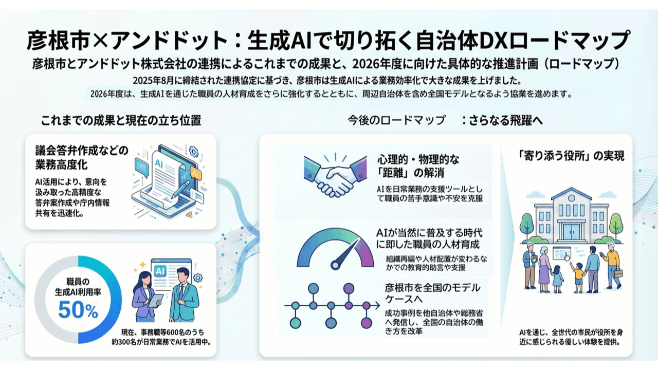 アンドドットは、総務省自治大学校との連携実績をはじめ、全国150自治体以上への生成AI活用支援を通じて培ったノウハウを活かし、彦根市のさらなるDX推進を支援してまいります。また、本取り組みの成果を全国へ発信し、地方自治体のAI活用のロールモデルとなることを目指します。